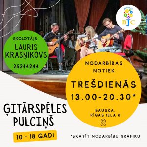 - Ģitārspēles pulciņš (10–18 gadi) – apgūstam ģitārspēles pamatus: akordus, ritmus, melodijas un dažādu stilu skaņdarbus. Nodarbībās izmantojam gan nošu pierakstu, gan tabulatūru, veidojam savu muzikālo gaumi un uzstājamies koncertos. Katrs var kļūt par sava skaņdarba izpildītāju un sajust mūzikas radīšanas prieku!